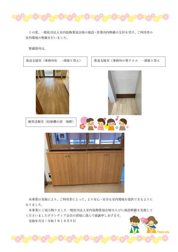 【きらら】徳島県室内装飾業協会 会員様にボランティアで施設修繕をしていただきました。